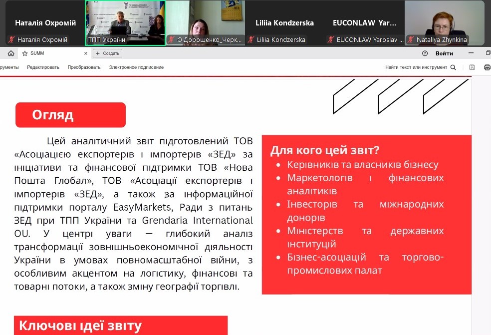Під час засідання Ради ТПП України з питань зовнішньоекономічної діяльності презентовано аналітичний звіт з питань міжнародної торгівлі України в контексті просування вітчизняного експорту в умовах воєнного стану та військових загроз; оцінка логістики та фінансових потоків.