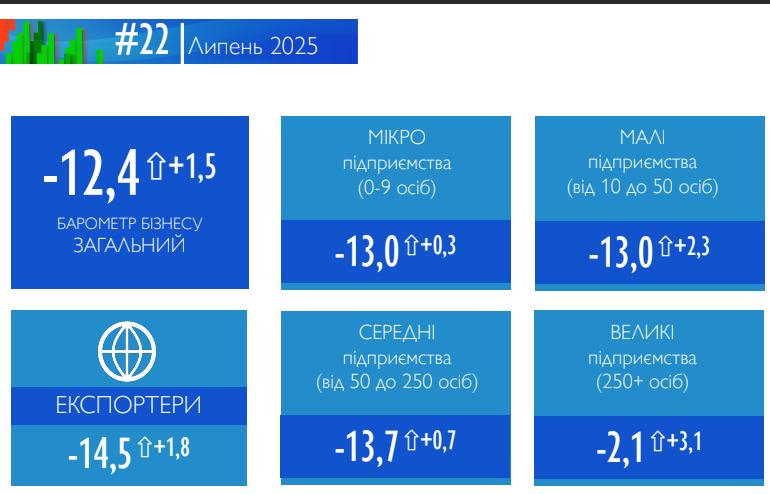 “Барометр Бізнесу” зафіксував, що песимізм українських підприємців у липні повільно відступає! У липні 2025 року загальний індекс дослідження “Барометру бізнесу” продемонстрував зростання до позначки -12,4 ⇧+1,5 пунктів, залишаючись у зоні негативних очікувань.