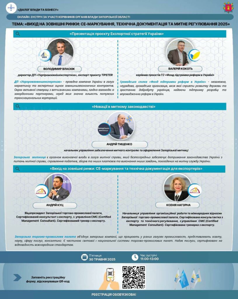 Проєкт «Діалог влади та бізнесу» триває. 30 травня Запорізька облдержадміністрація запрошує на чергову зустріч, присвячену виходу українського бізнесу на зовнішні ринки. Серед спікерів зустрічі – експерти Запорізької торгово-промислової палати.