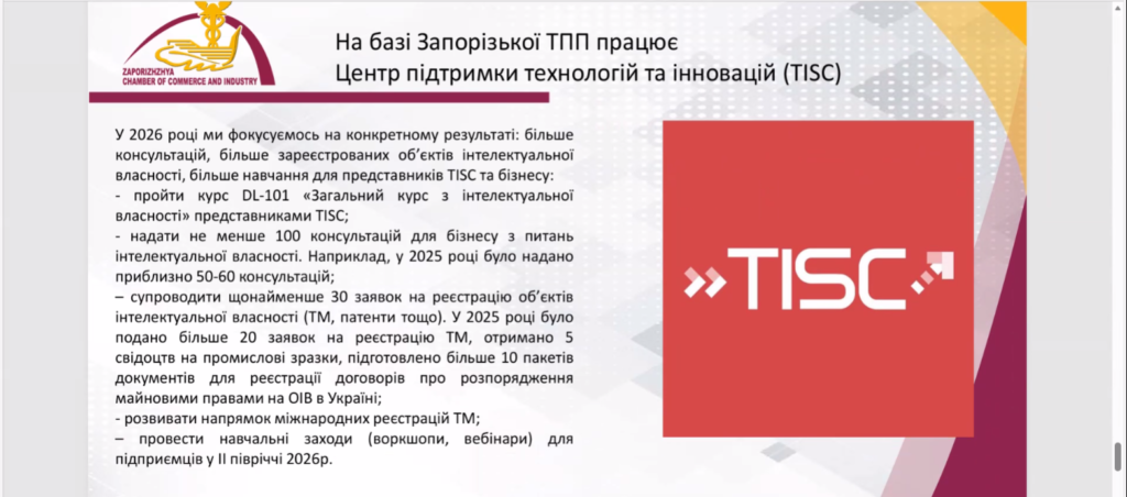 Експерти Центру підтримки технологій та інновацій (TISC), що понад рік працює на базі Запорізької ТПП, долучилися до стартової стратегічної сесії про розвиток мережі Центрів у 2026 році.
