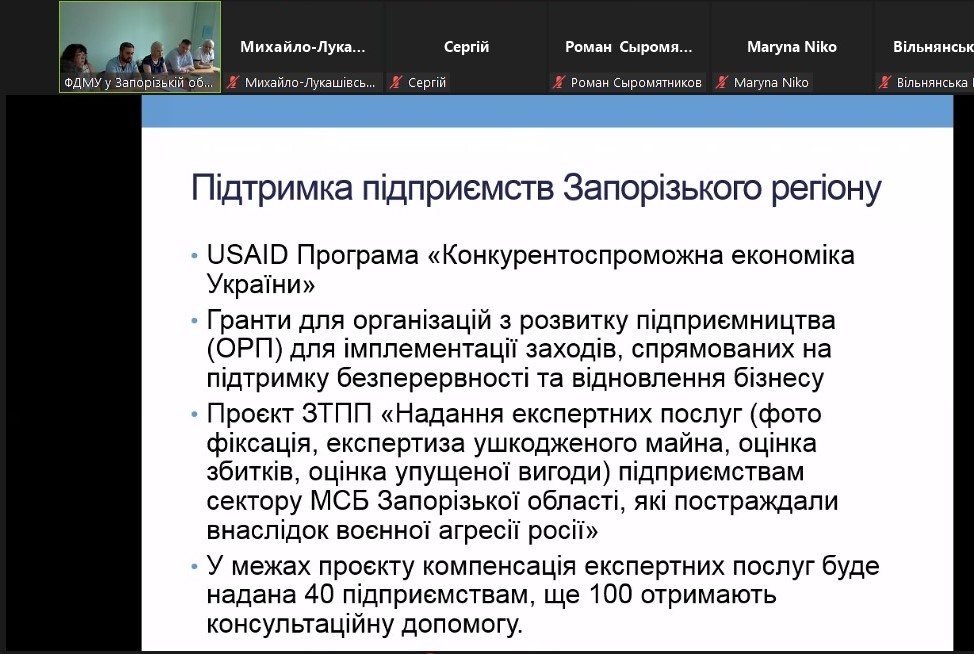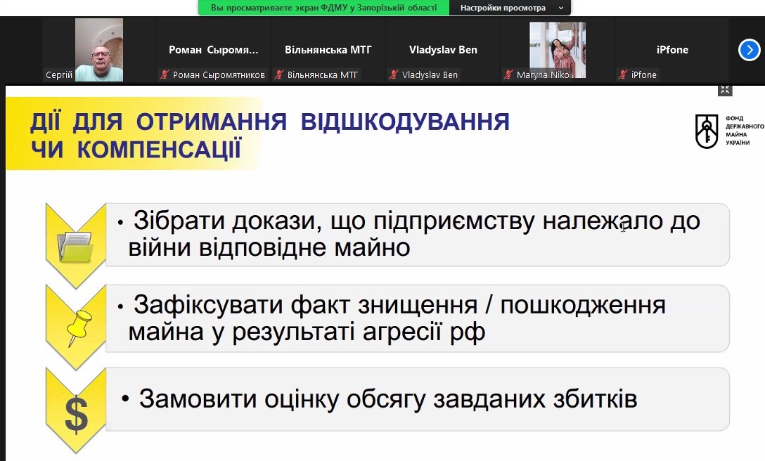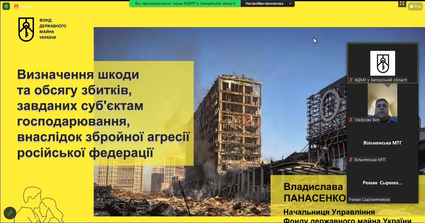 Владислава Панасенко, начальниця Управління забезпечення реалізації повноважень у Запорізькій області РВ Фонду державного майна України по Дніпропетровській, Запорізькій та Кіровоградській областях надала інформацію щодо «Методики визначення шкоди та обсягу збитків, завданих підприємствам, установам та організаціям усіх форм власності внаслідок знищення та пошкодження їх майна у зв’язку із збройною агресією російської федерації, а також упущеної вигоди від неможливості чи перешкод у провадженні господарської діяльності».