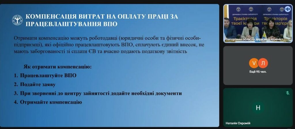 До онлайн-зустрічі долучилися близько 100 учасників. Вони мали змогу поставити питання фахівцям Запорізького обласного центру зайнятості та Департамента економічного розвитку і торгівлі ЗОДА, отримати консультації та презентаційні матеріали.