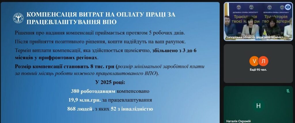 Одним із пріоритетних напрямів роботи Запорізького обласного центру зайнятості є офіційне працевлаштування внутрішньо переміщених людей. Для цього діє державна програма компенсації витрат роботодавцям на оплату праці ВПО. У 2025 році 380 запорізьким підприємцям було компенсовано 19,9 млн грн за працевлаштування понад 860 вимушених переселенців.