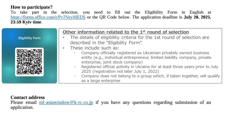 Запрошуємо малі та середні підприємства (МСП), що експортують, взяти участь у програмі “Asia Window” – 4-місячній програмі (вересень-грудень 2025 року), яка реалізується в рамках Проєкту зі зміцнення залучення приватного сектору до відновлення України (Підтримка МСП в Україні) за фінансування Японського агентства міжнародного співробітництва (JICA). Пілотна програма підтримає 10 МСП, які мають значний потенціал для експортної експансії на азійські ринки (включаючи Японію), в розробці та реалізації їхніх експортних планів.