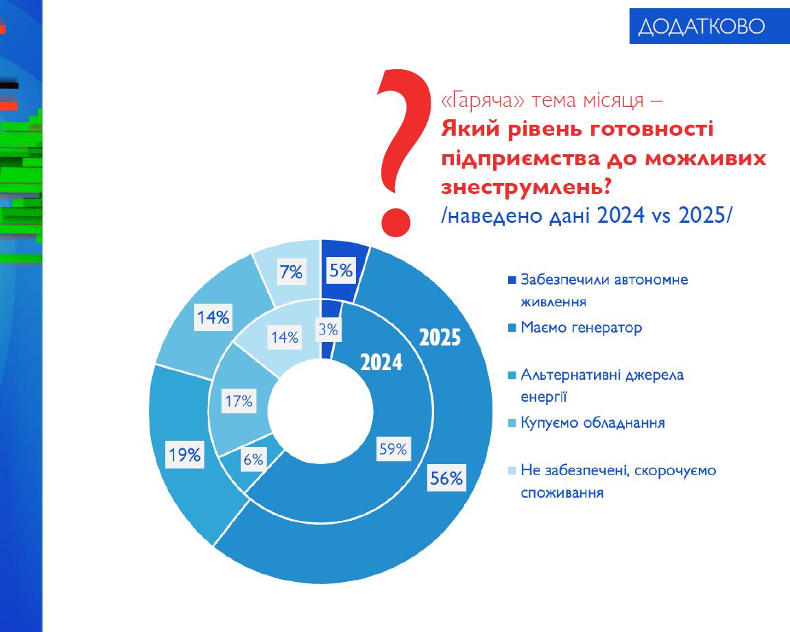 Так, 56% підприємств мають генератори (⇩-3% порівняно з листопадом 2024), 19% – альтернативні джерела живлення (⇧+13%), а ще 5% забезпечили собі автономне живлення (⇧+2%).