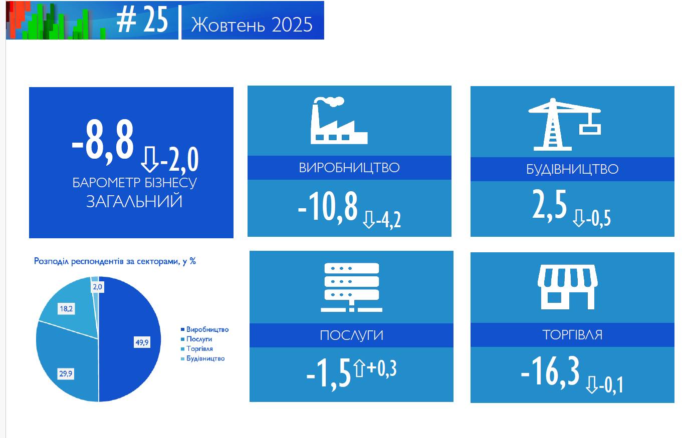 Загалом, у жовтні 2025 року загальний індекс “Барометру бізнесу” продемонстрував зниження до позначки -8,8⇩-2,0 пунктів, залишаючись у зоні негативних очікувань.
