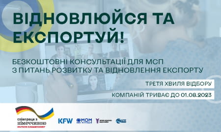 «Відновлюйся та експортуй» – проєкт, який дозволяє 200 компаніям, які є представниками мікро-, малого та середнього бізнесу, впродовж 2023 року отримати консультації з питань розвитку та відновлення експорту:
