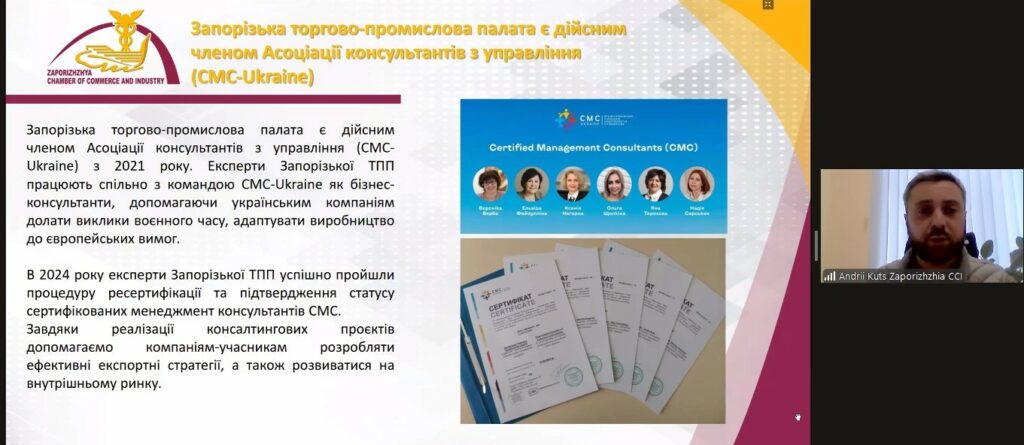 Запорізька ТПП є дійсним членом Асоціації консультантів з управління CMC-Ukraine. Її експерти допомагають компаніям адаптувати виробництво до вимог ЄС, розробляють експортні стратегії, проводять безоплатні тренінги з оцінки відповідності продукції та консультують щодо маркування СЕ.