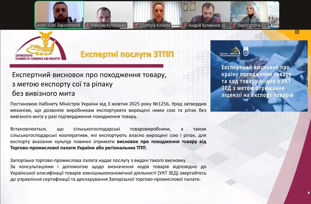 Також, відповідно до постанови Кабінету Міністрів України №1256 від 3 жовтня 2025 року, агровиробники можуть експортувати сою та ріпак без вивізного мита, за умови підтвердження походження товару. Запорізька ТПП вже надає послугу з видачі таких висновків, допомагаючи сільгосппідприємствам скористатися новими умовами експорту.